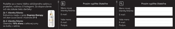 Za první novou klientku přípravek, exkluzivní masku ve spreji Express Therapy od Jean Louis David v hodnote 567 Kč (21 Eur) a za druhou klientku okamžitou 15% slevu z celkové ceny služby v salóně při Vaší další návštěvě.