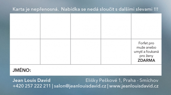 Při Vaší první návštěvě v saloně Jean Louis David získáte věrnostní kartu.